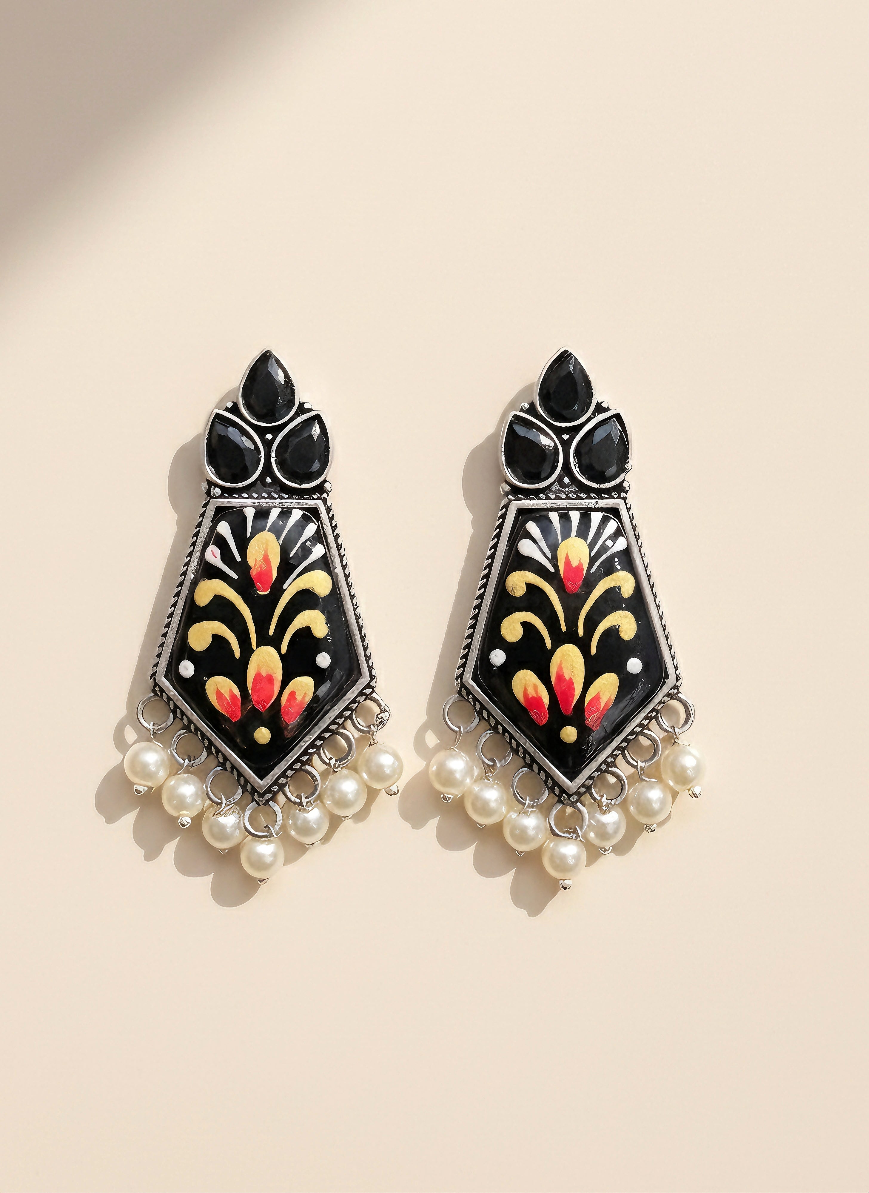 Decorative earrings with black, yellow, and red patterns on a white fabric backgroundWoman wearing a traditional earring with a blurred backgroundHand Painted