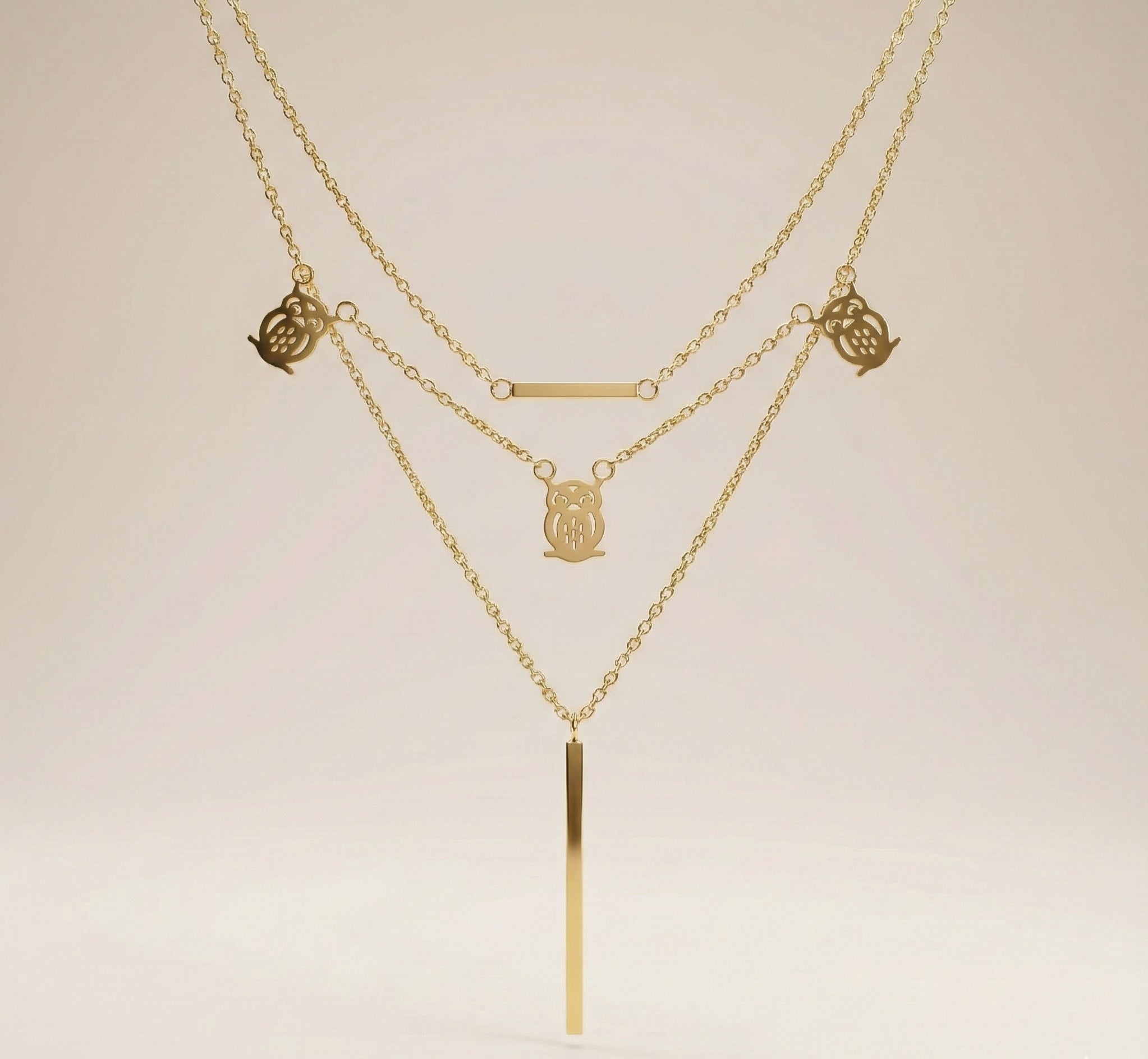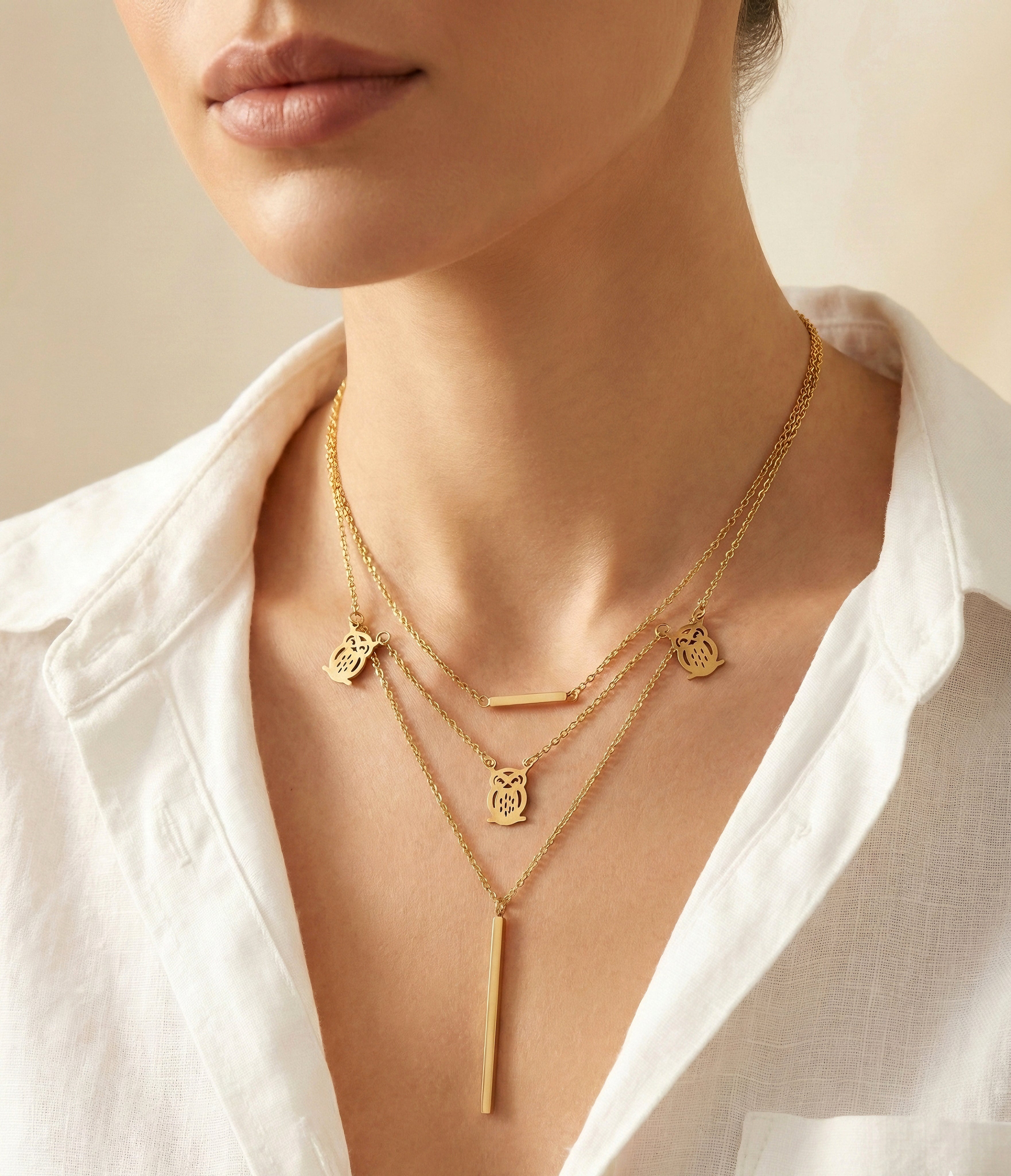 Crafted from high-quality stainless steel, this necklace is anti-tarnish, water-resistant, and long-lasting, making it perfect for daily wear. The layered design combines minimal gold bars with symbolic owl charms—representing wisdom, protection, and calm confidence.