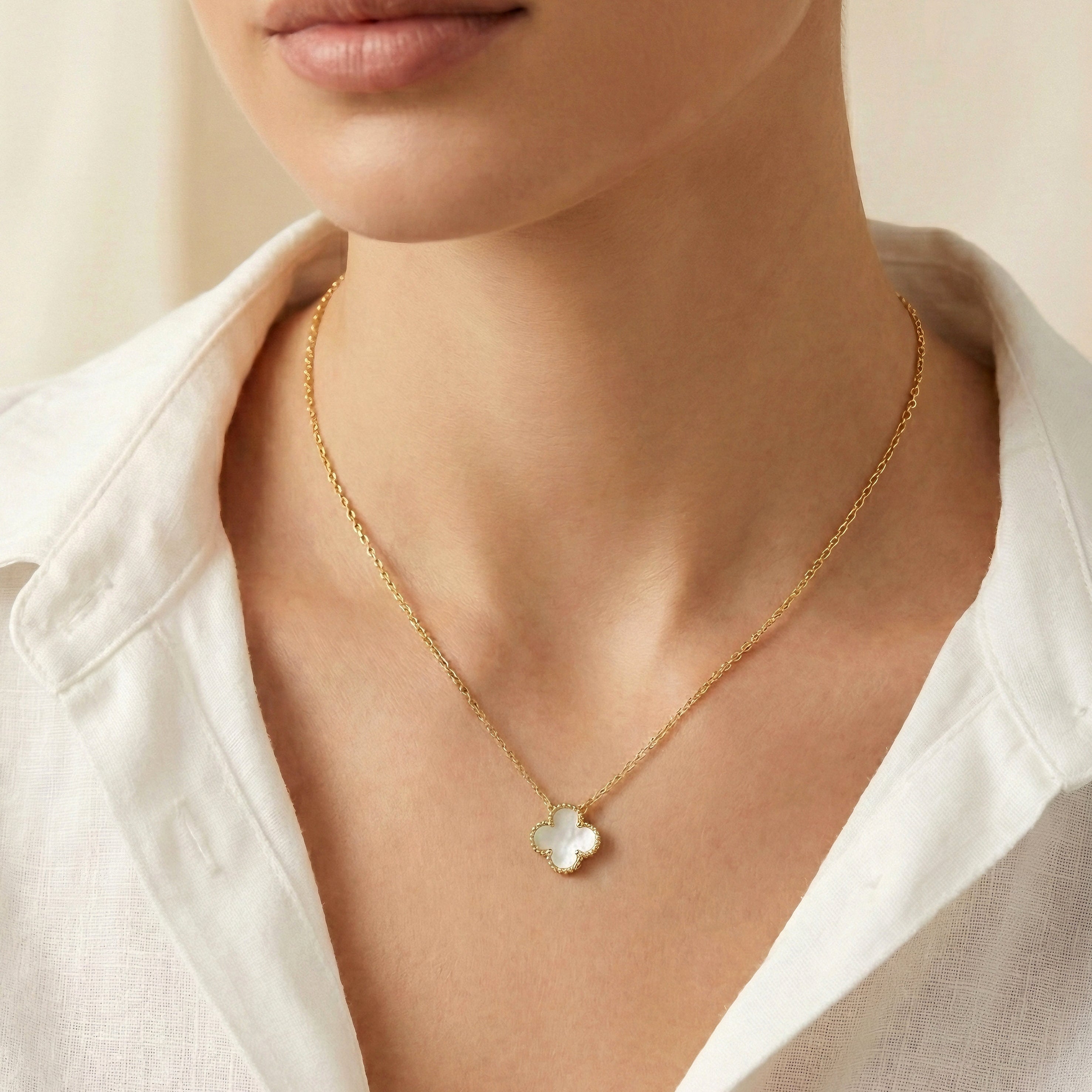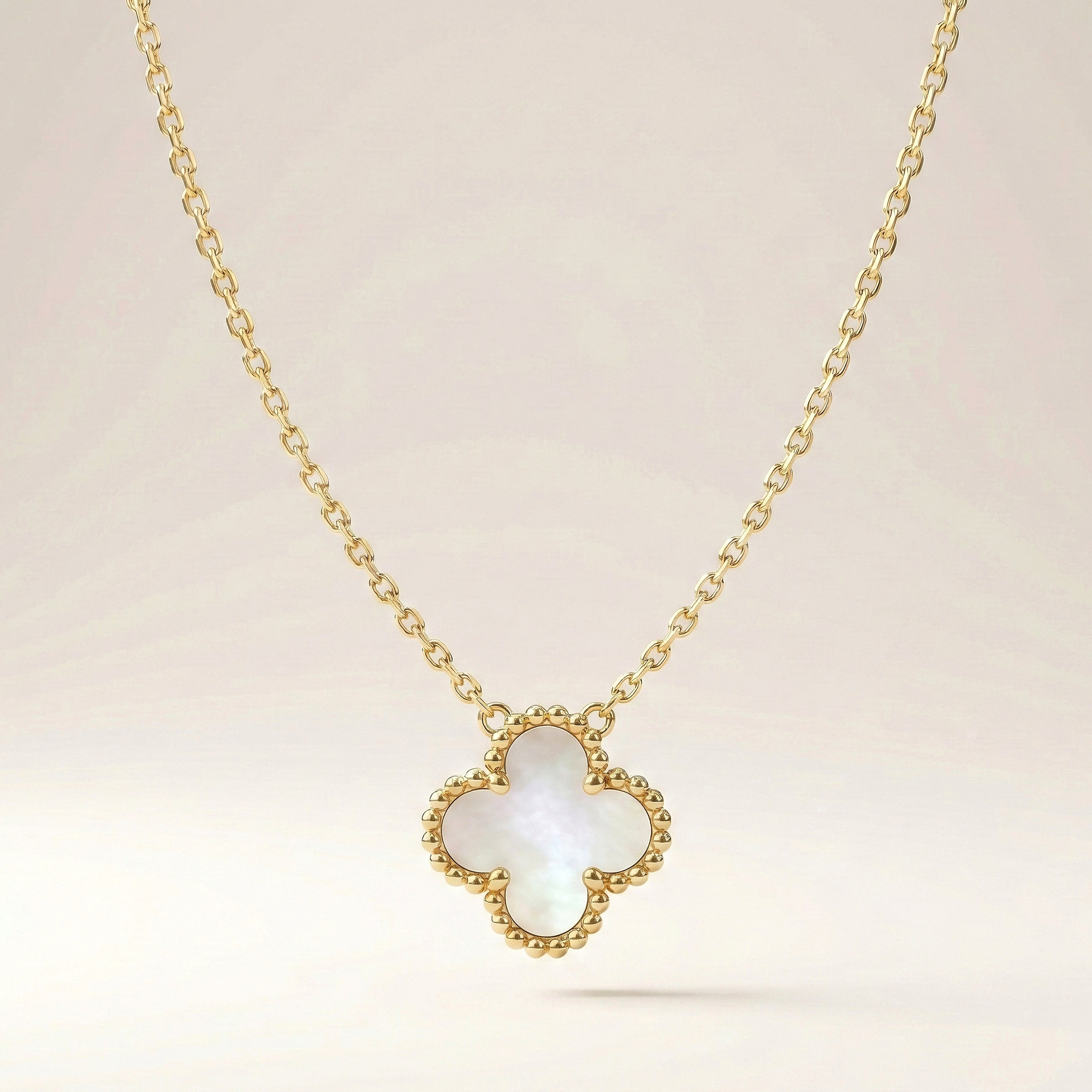 Its four-petal clover silhouette rests lightly against the skin, symbolising balance, calm, and subtle luck. Crafted in anti-tarnish stainless steel, the pendant is framed with soft golden beading that catches light gently, never loudly.