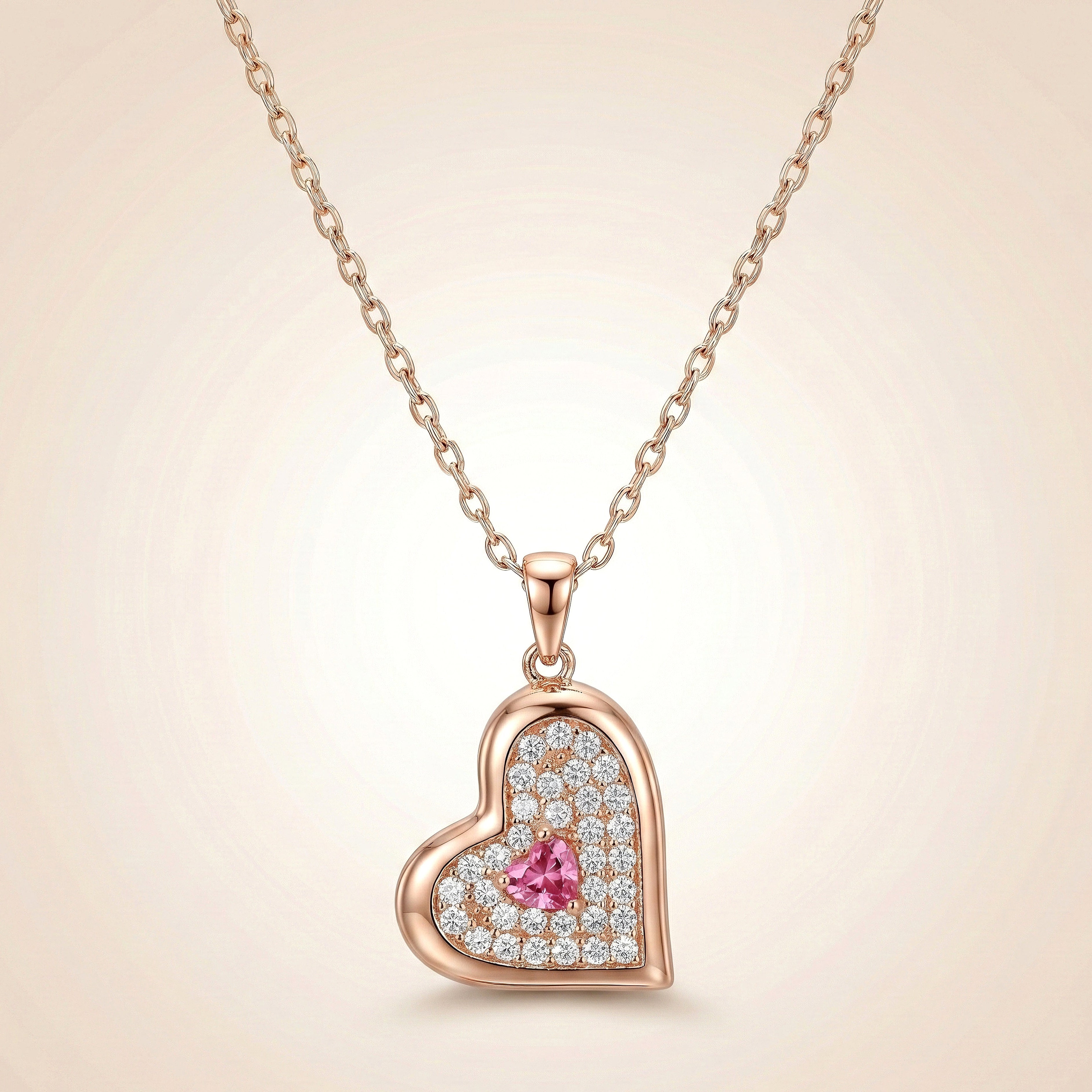 A softly sculpted heart cradles a blush-pink stone at its centre like a secret feeling, gently protected yet glowing from within. The pavé sparkle around it mirrors emotions unspoken, moments remembered, and love that doesn’t shout but stays.