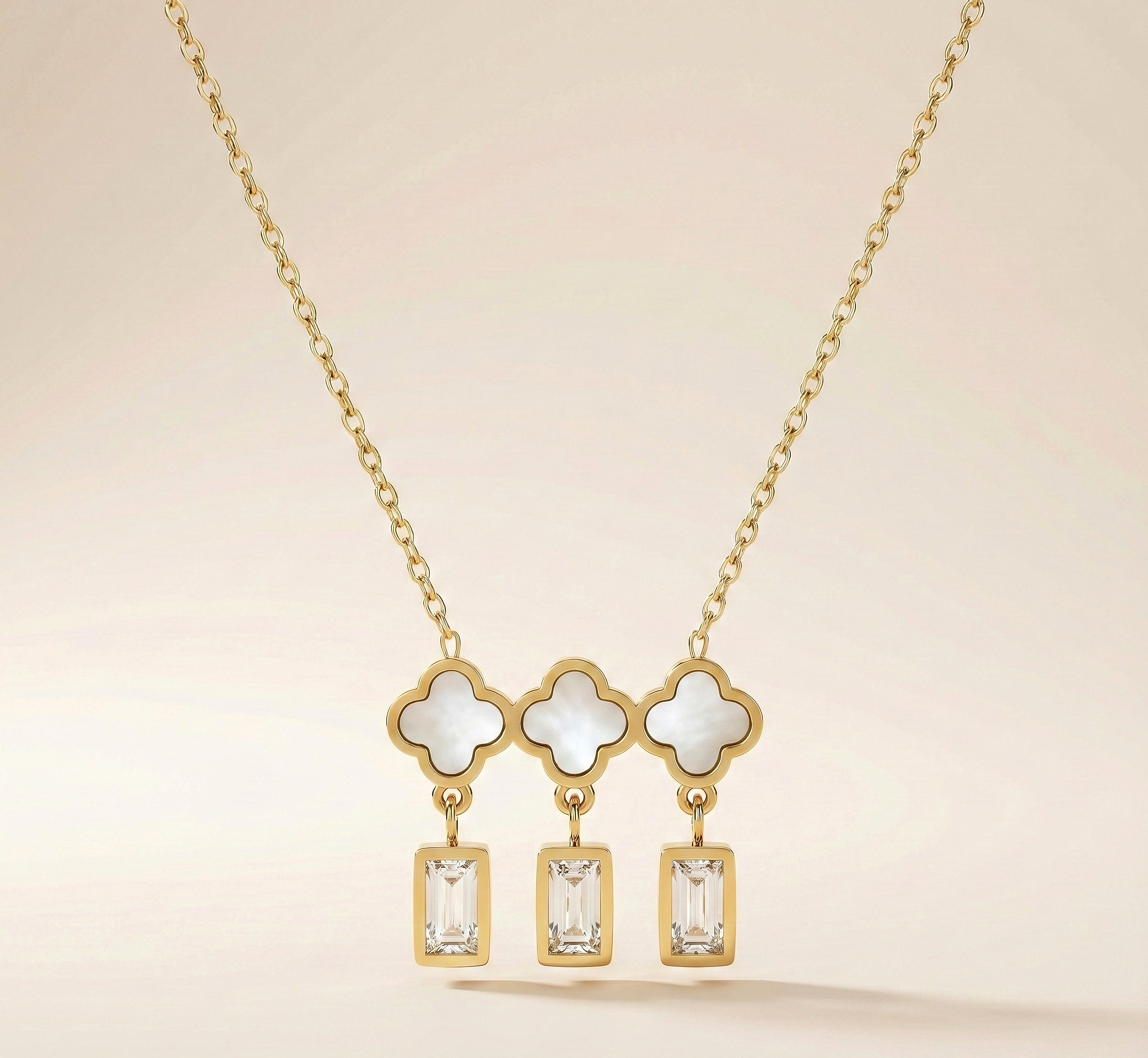 Trinity Glow is inspired by the balance of mind, soul, and self. The delicate clover silhouettes represent quiet luck and protection, while the vertical crystal drops reflect light like fleeting moments of grace. Designed to move softly with you, this necklace feels effortless yet intentional. A piece that doesn’t shout luxury but whispers it beautifully.
