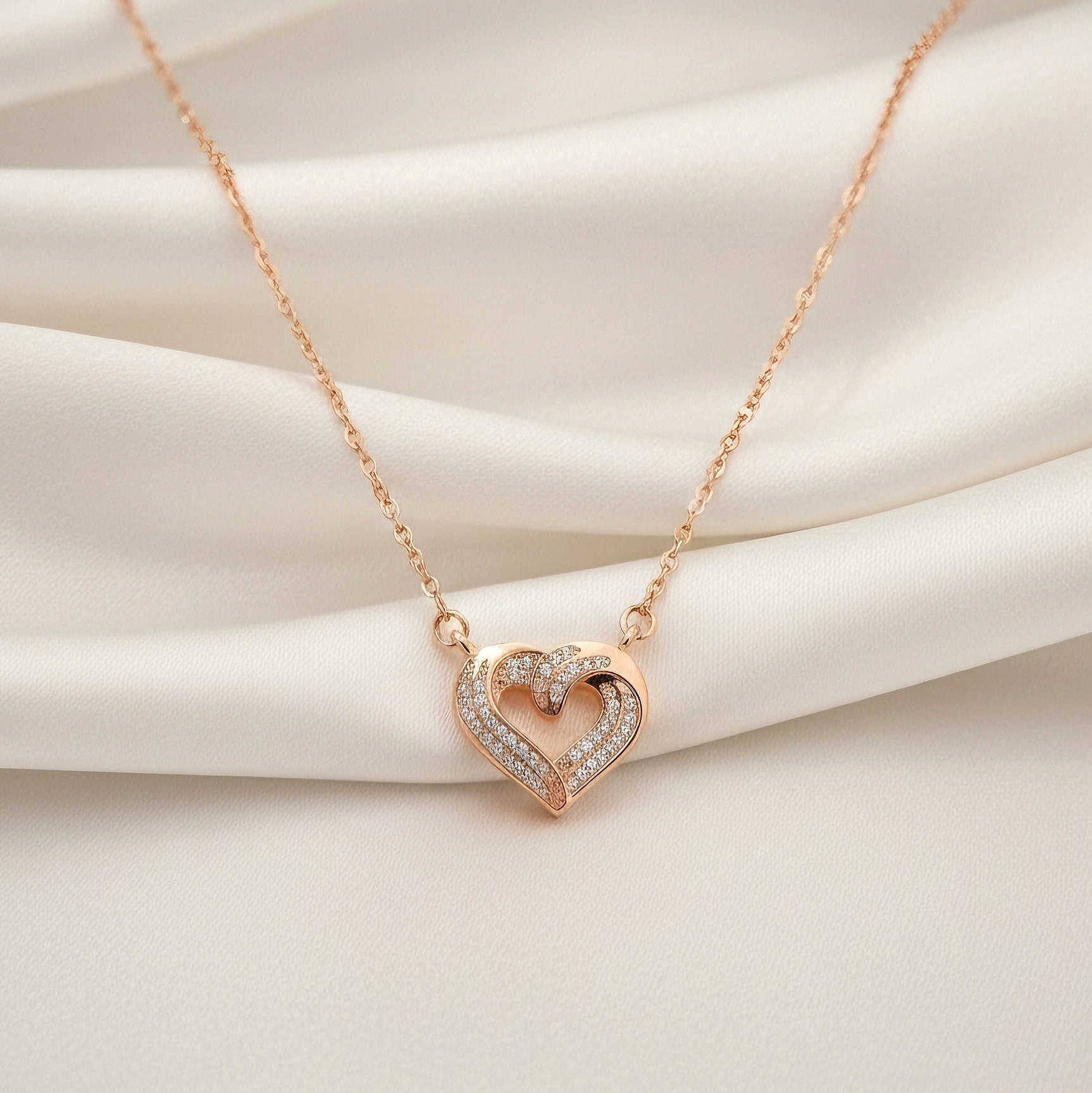 Twin Pulse is crafted as two hearts intertwined in a quiet rhythm, symbolising love that moves together yet breathes freely. The outer heart flows in a soft rose-gold curve, while the inner pavé heart glimmers gently like a promise held close, not loud, but everlasting.