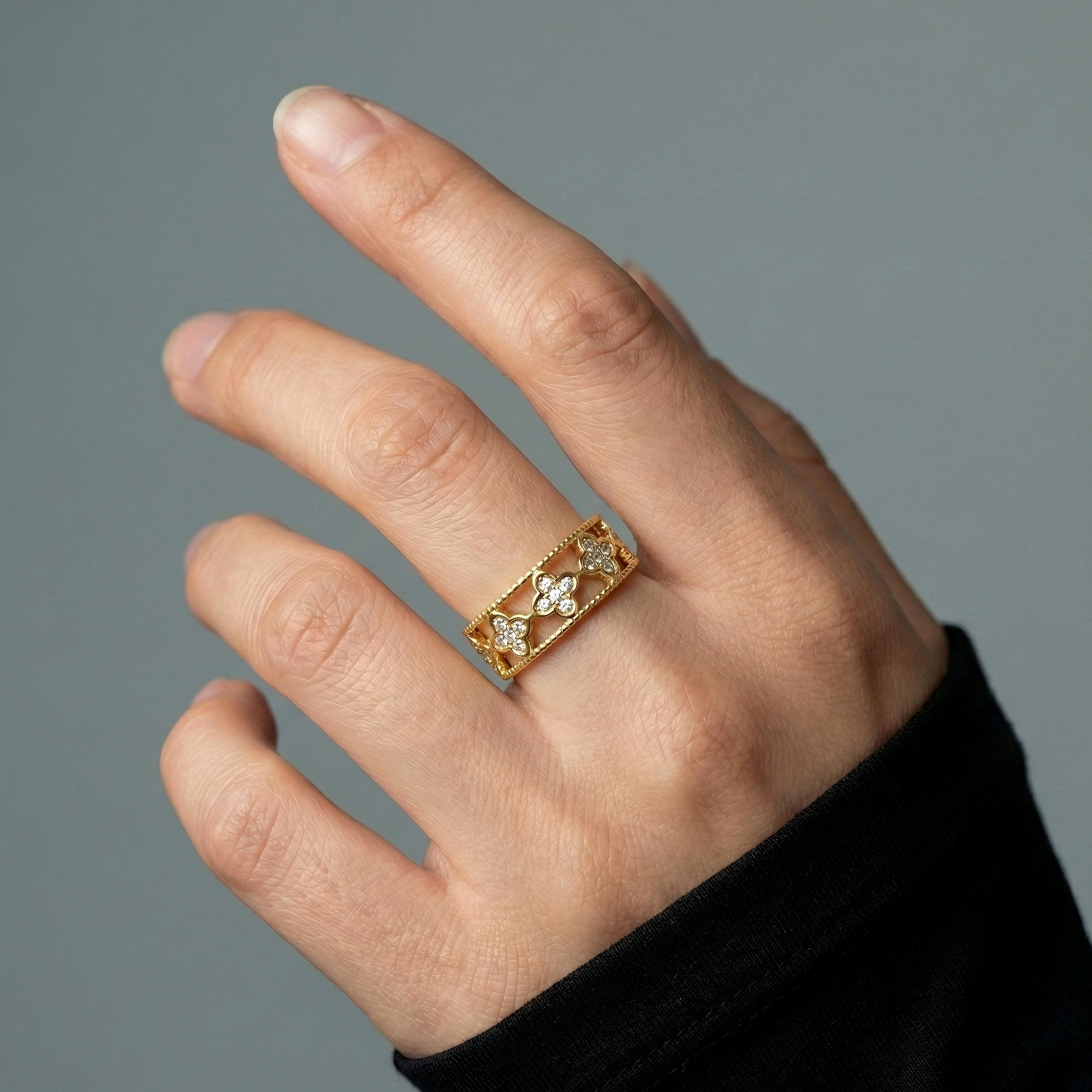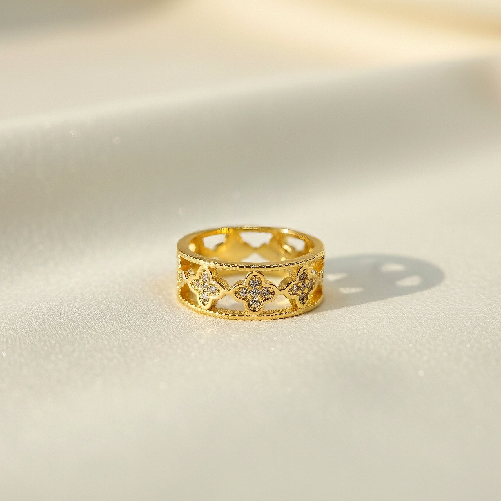 Add understated elegance to your jewellery collection with the Evvara Vogue Floral Cutwork Ring. Designed in a refined gold-tone finish, this ring features an intricate openwork pattern with floral motifs and subtle stone detailing that catches the light beautifully.