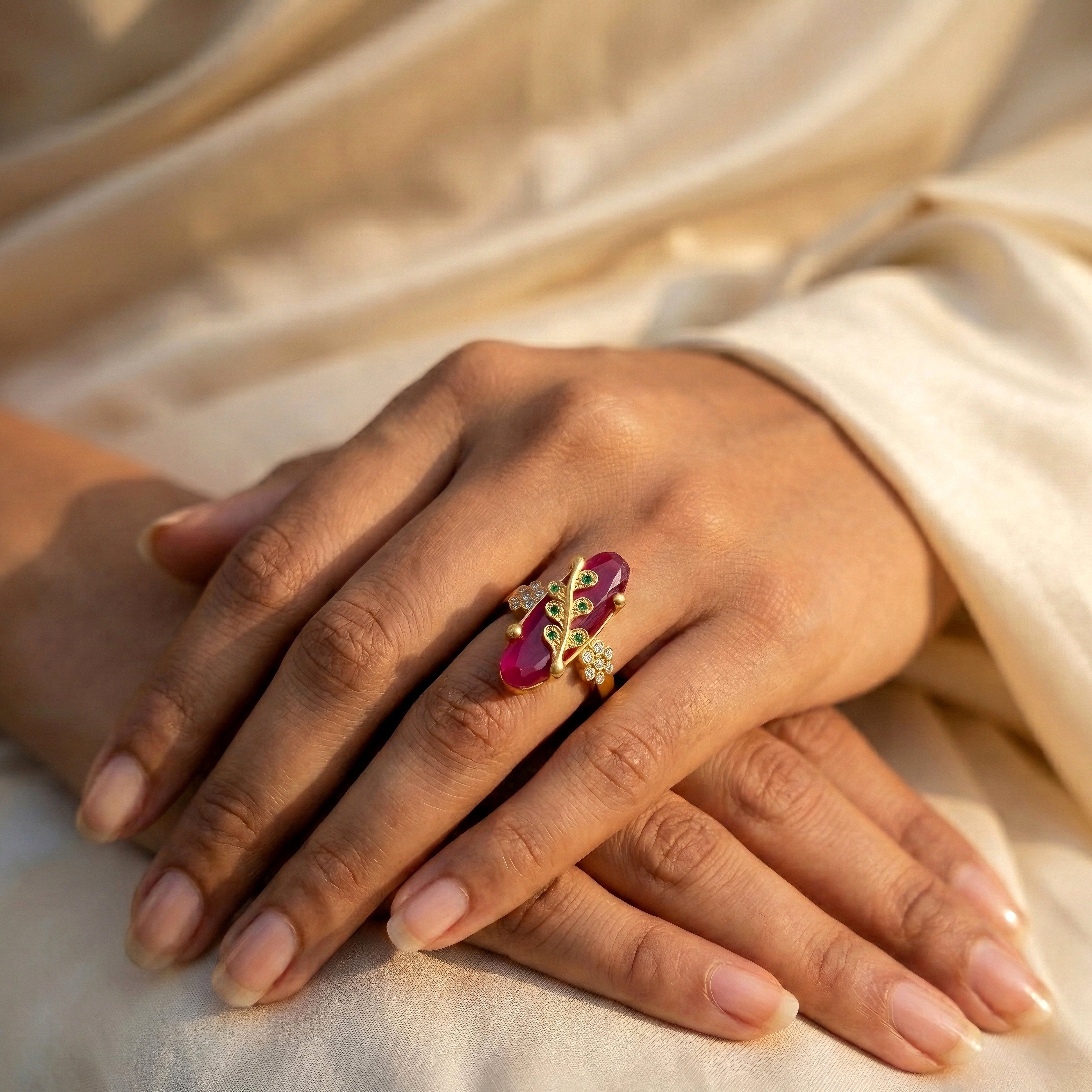 A bold ruby-red statement ring with elegant leaf detailing and subtle stone accents. Lightweight, anti-tarnish, and designed to stand out effortlessly.