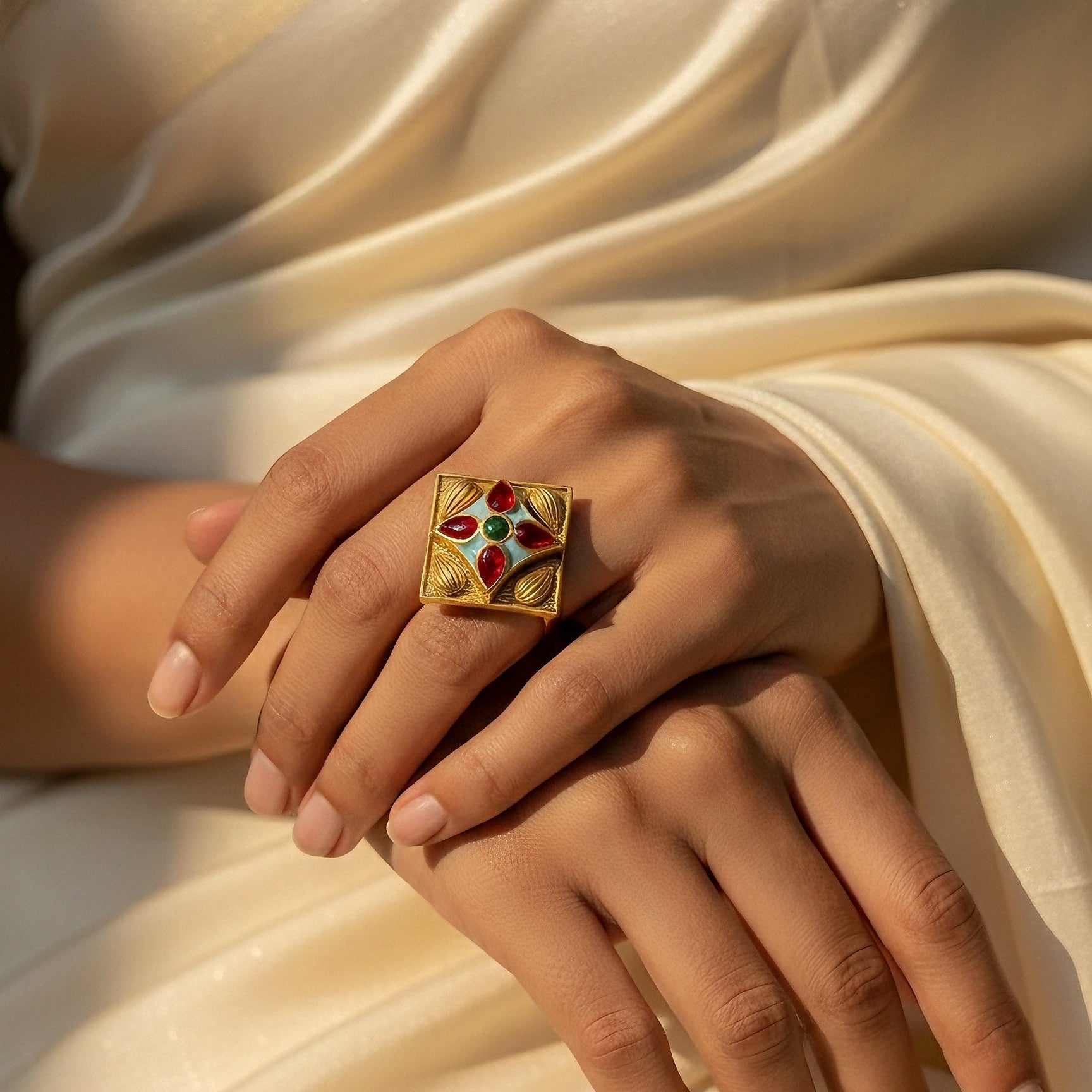 Celebrate color, culture, and craftsmanship with this multicolor square motif statement ring. Designed with a bold square face, intricate engraved detailing, and vibrant red and green stone accents set over a soft pastel enamel base, this ring brings a beautiful blend of traditional charm and modern elegance.