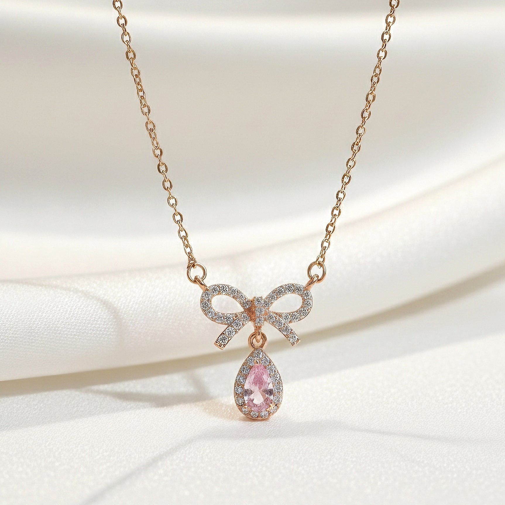 A softly sculpted bow—symbol of elegance and femininity, rests gently at the neckline, holding a blush-pink teardrop that catches light like a quiet emotion waiting to be felt.